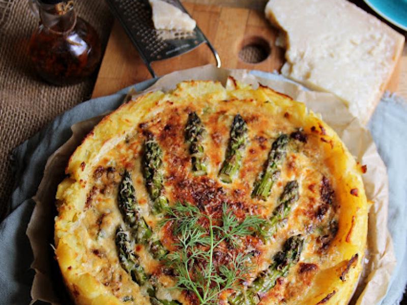 Kochani, donoszę, że po deszczowych dniach wygrzewałam się na trawie w słońcu w środku lasu i to był jeden ze wspanialszych momentów minionego weekendu! :)Już nie mogłam doczekać się tej cieplejszej beztroski, dlatego stawiam dziś na stole absolutnie fenomenatną tartę ze szparagami, by uczcić te wiosenno-letnie przyjemności.To pierwsze szparagi w tym sezonie w mojej kuchni i tym razem postanowiłam podać je w złotej ziemniaczanej koronie i na ziołowej pierzynce z suszonymi...